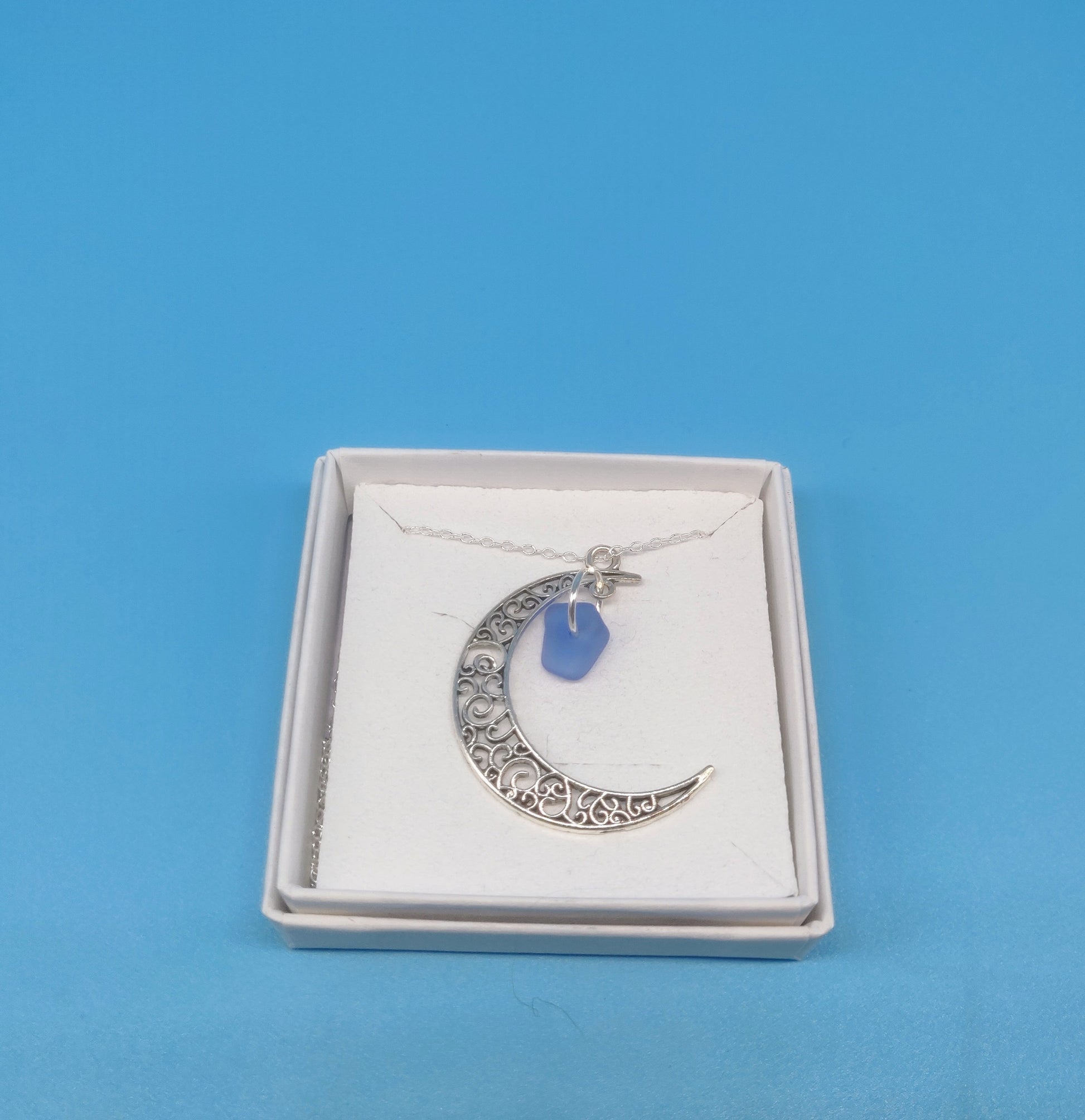 This classic, elegant necklace features a single piece of authentic sea glass accented with a sleek moon pendent. It comes on a sterling silver curb link chain available in your choice of length. Please message me to let me know your preferred size of chain.