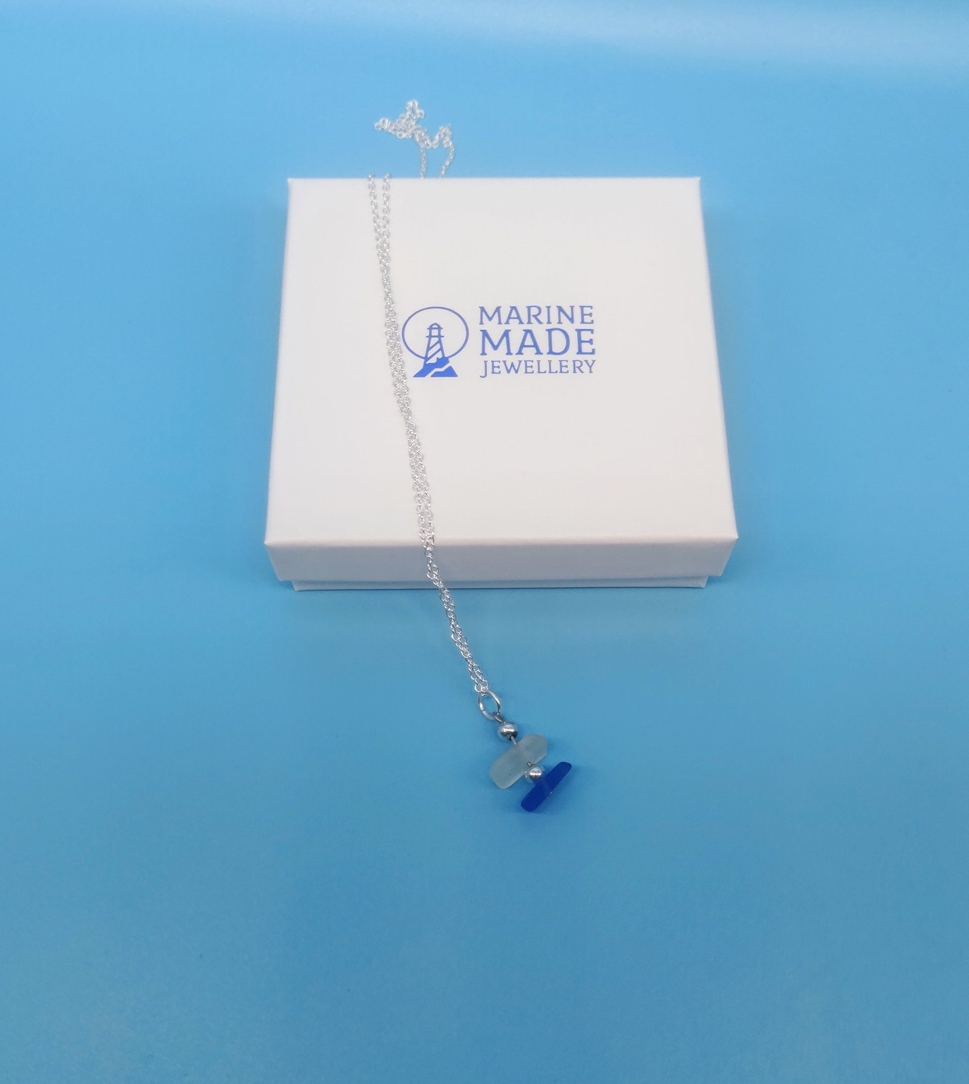 This classic blue and white sea glass, elegant necklace features a duo of authentic sea glass pieces accented with a sleek sterling silver bail.